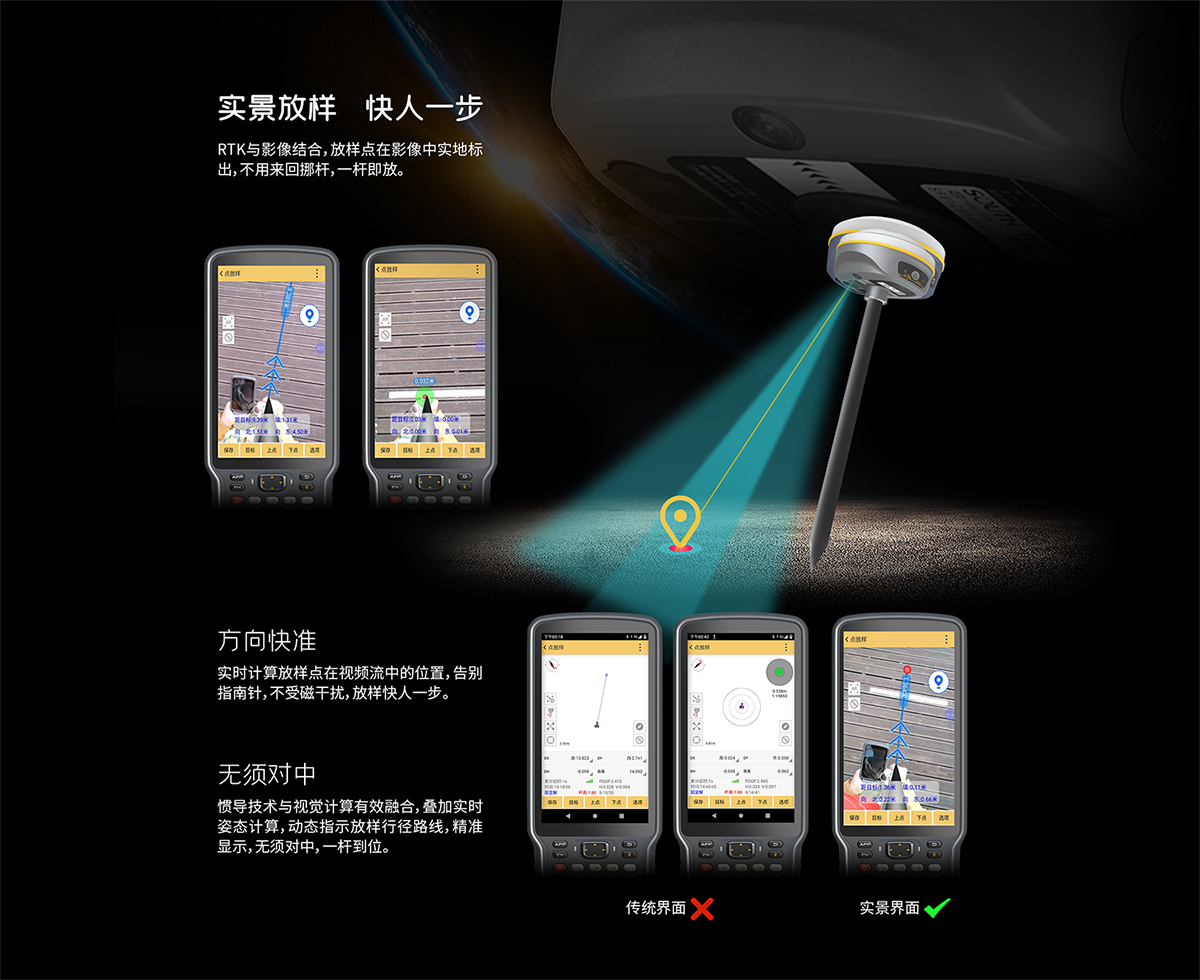 RTK與影像結合,放樣點在影像中實地標出,不用來回挪桿,一桿即放。